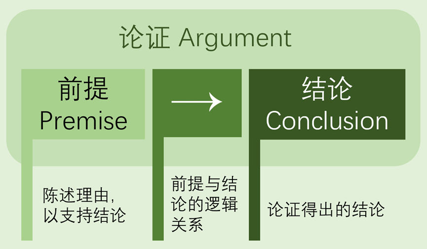 论证(argument)是由前提(premise)和结论(conclusion)构成的,前提为结论提供理由,结论是前提所支持的断言。“人都会死,苏格拉底是人,苏格拉底也会死”。在这个论证中,前两个分句是前提,最后一句是结论。论证是批判性思维之所以能够进行的基本单位。无论多么复杂的论证过程,都是由一个个小的、可评判的论证组成的。