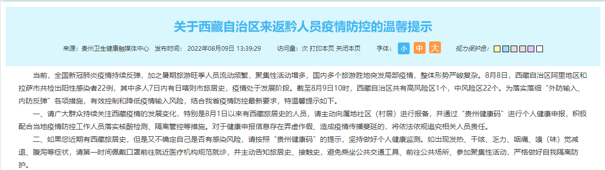 关于西藏自治区来返黔人员疫情防控的温馨提示