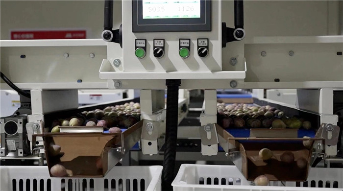 在新疆产地智能供应链中心内,在现代化自动分选设备上,每颗新鲜采摘的新梅都要经过清洗、烘干、红外摄像,以秒级的速度自动区分重量、大小、外观瑕疵和内伤,随后被送到相应标准的输出框内,进行人工检验、自动化包装。