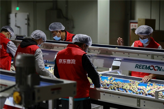2021年10月,伽师县政府和广东援疆指挥部共建“粤伽新梅产业园”,其中4座冷库交由京东物流负责运营;今年,京东物流加大资源投入,率先引入12条国内领先的智能分选设备,实现新梅的全流程自动化拣选,日加工峰值超50吨。