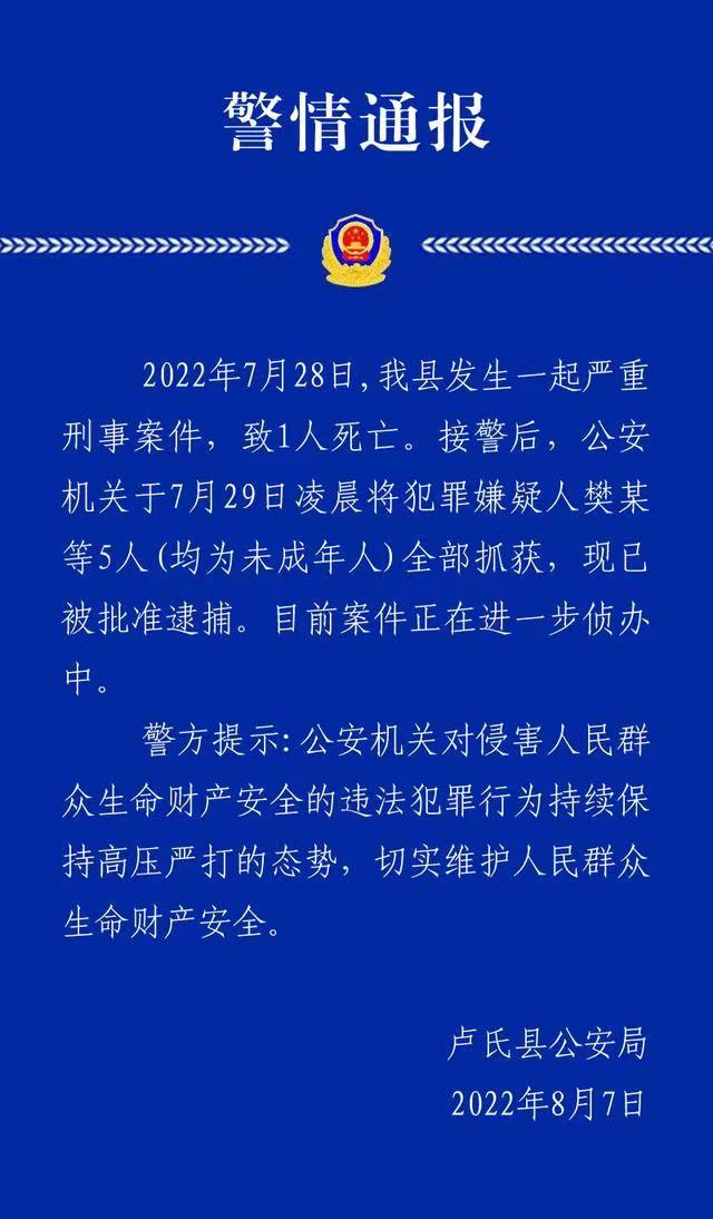 近日,有网友发文,称河南卢氏县张麻村发生恶性打人事件。8月6日,@平安三门峡卢氏 回应称,该案嫌疑人已于案发当晚全部抓获,案件正在依法快速办理中。该文对案件和受害人伤情的说法与事实严重不符,请广大网民不信谣、不传谣。(河南省三门峡市卢氏县公安局)