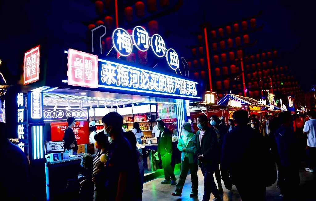 获评“最美中国旅游城市”的梅河口市在医药健康、食品加工、商贸物流、现代服务业四大主导产业的基础上,激活旅游产业新引擎。梅河口东北不夜城汇集古风古韵、关东风情、风味美食、璀璨烟花、行为艺术、景观打卡等诸多元素,主要包括东北不夜城主街区、月亮湾元宇宙集市、云南酒吧街、陕西美食街、爨街美食城提升区五大板块。