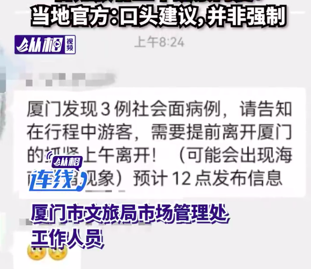 至于告知游客提前离厦的信息,工作人员表示:“这个是口头建议,没有强制要求大家离开。”