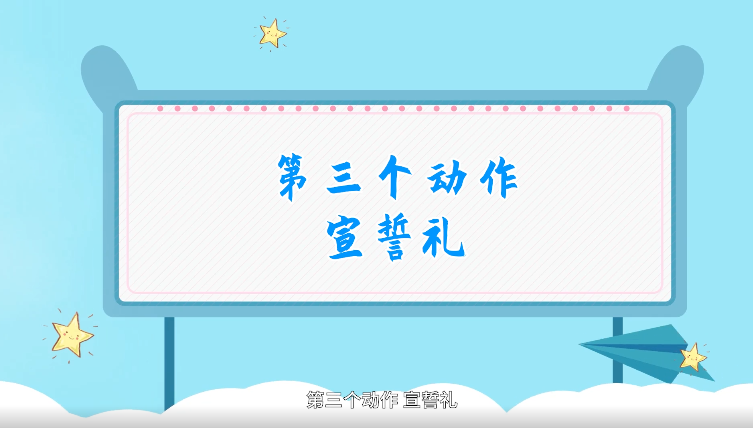 宣誓礼:正步位站立,右臂从身体右侧举起,大臂与肩膀保持水平,小臂向头部内收45度,手部握拳与太阳穴同高。