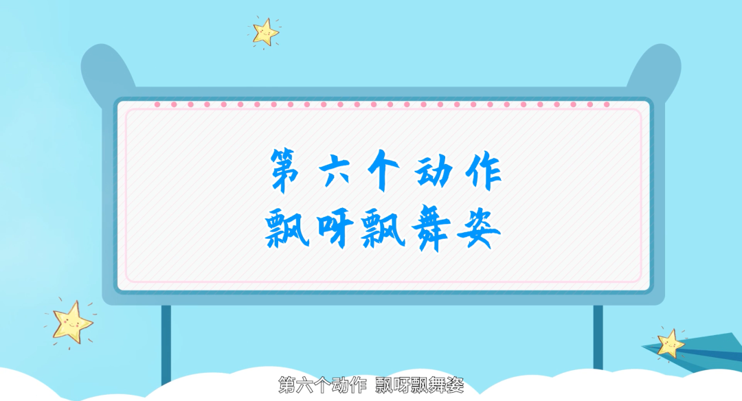 飘呀飘舞姿:双臂与肩同宽正上位,掌心相对,小臂右左摆动,模仿国旗在空中飘荡。