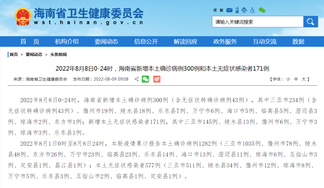 2022年8月8日0-24时,海南省新增本土确诊病例300例(含无症状转确诊病例43例),其中三亚234例(含无症状转确诊病例43例)、儋州19例、陵水18例、乐东7例、万宁6例、海口5例、临高5例、澄迈3例、琼海2例、东方1例;新增本土无症状感染者171例,其中三亚145例、陵水13例、儋州6例、万宁3例、琼海3例、乐东1例。