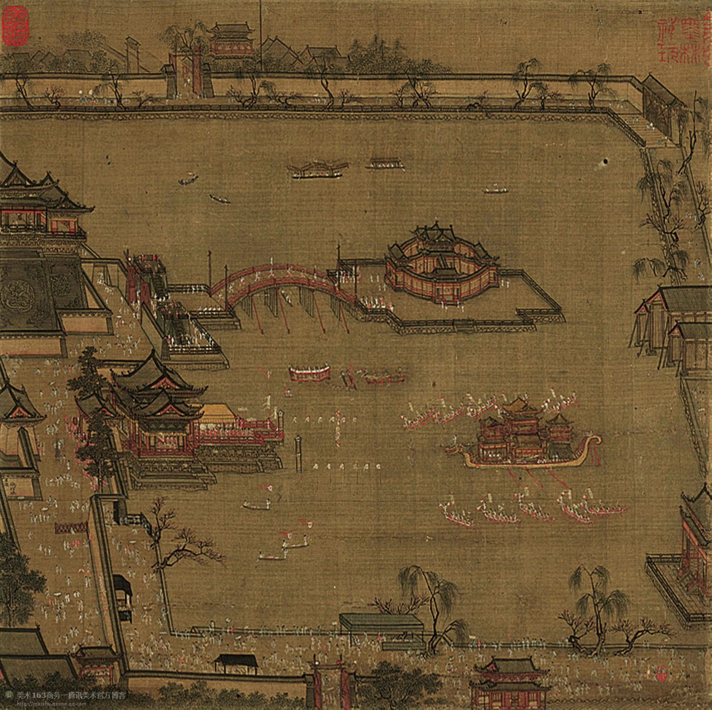 金明池又名西池、教池,遗址在今河南省开封市,是以一个略近方形的大水池为主体的皇家园林。金明池原是神卫虎翼水军内习水战的地方,南方战事平定后,宋徽宗于池内增建殿宇,金明池的用途开始从实用转向娱乐,金明池便成为了皇帝春游和观看龙舟竞赛的地方。