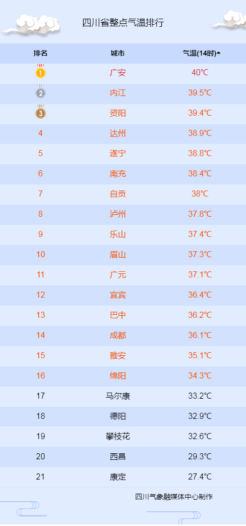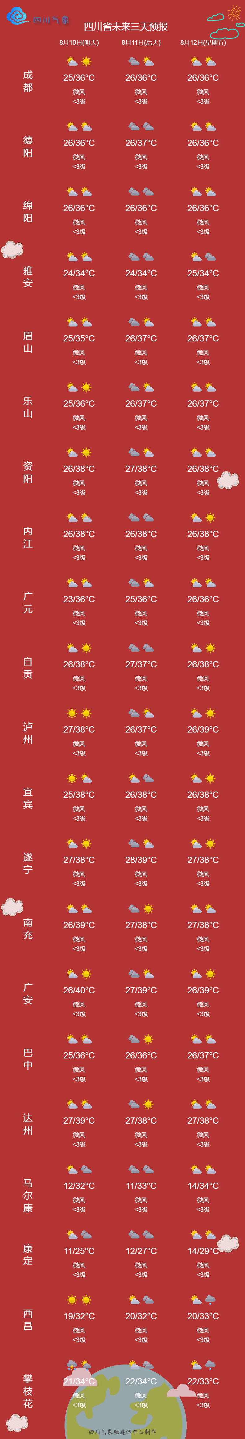24小时内,盆地最低气温:26~29℃;最高气温:西部:36~39℃,其余地方:39~41℃。