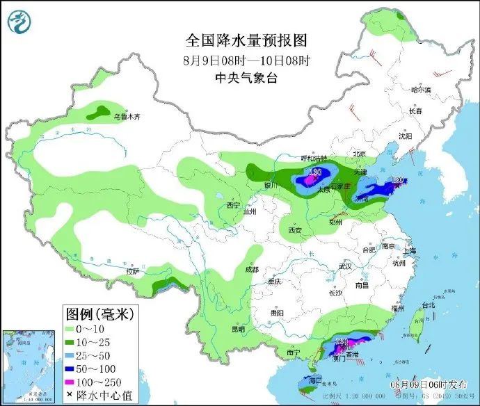 未来三天天气预报:8月9日08时至10日08时,内蒙古河套地区、宁夏北部、陕西北部、山西中北部、河北中南部、山东、广东中南部、海南岛等地部分地区有中到大雨,其中,陕西北部、山西北部、山东中部和东部、广东南部沿海、海南岛西北部等地部分地区有暴雨或大暴雨(100~130毫米)。内蒙古东部、东北地区、广东、海南岛等地部分地区有4~5级风。南海大部、琼州海峡、北部湾东部海面和广东沿海、海南岛东部沿海、以及南沙群岛附近海域、西沙群岛附近海域、中沙群岛附近海域将有6-7级风,低压或风暴中心附近海域风力可达8-9级、阵风10级。