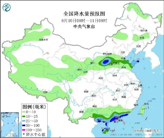 8月10日08时至11日08时,陕西北部、山西中部、河北南部、山东北部和东部、广西南部、广东南部和海南岛等地有中到大雨,其中,陕西北部、山西中西部、广西南部沿海、广东南部沿海、海南岛西北部等地部分地区有暴雨或大暴雨(100~110毫米)。内蒙古东部、黑龙江、新疆东部、广东南部、海南岛等地部分地区有4~6级风。北部湾、南海西北部、琼州海峡将有7~8级、阵风9级的风,南海东北部海域将有6~7级、阵风8级的东南风。