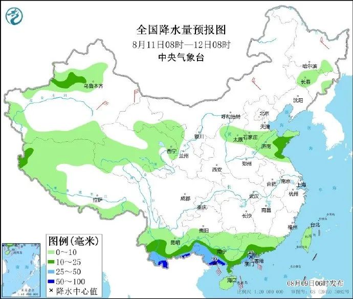 8月11日08时至12日08时,新疆沿天山地区和伊犁河谷、山东东南部、云南南部、广西南部、广东南部等地部分地区有中到大雨,其中,云南南部、广西南部沿海等地局部地区有暴雨(50~90毫米)。内蒙古东部、新疆东部、广东和广西南部沿海、海南岛等地部分地区有4~6级风。