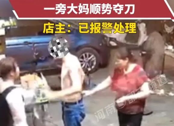 “店主遭男子持刀威胁,大妈淡定夺刀”的视频