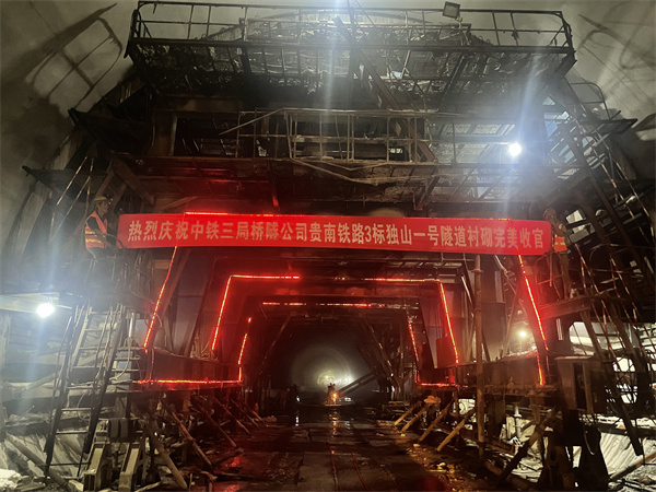 2022年8月8日,随着独山一号隧道溶洞段最后一环衬砌混凝土浇筑完成,至此,由中铁三局承建的新建贵南铁路贵州段3标线下主体工程施工结束,标志着贵南高铁路贵州都匀段所有的主体工程全部完工。