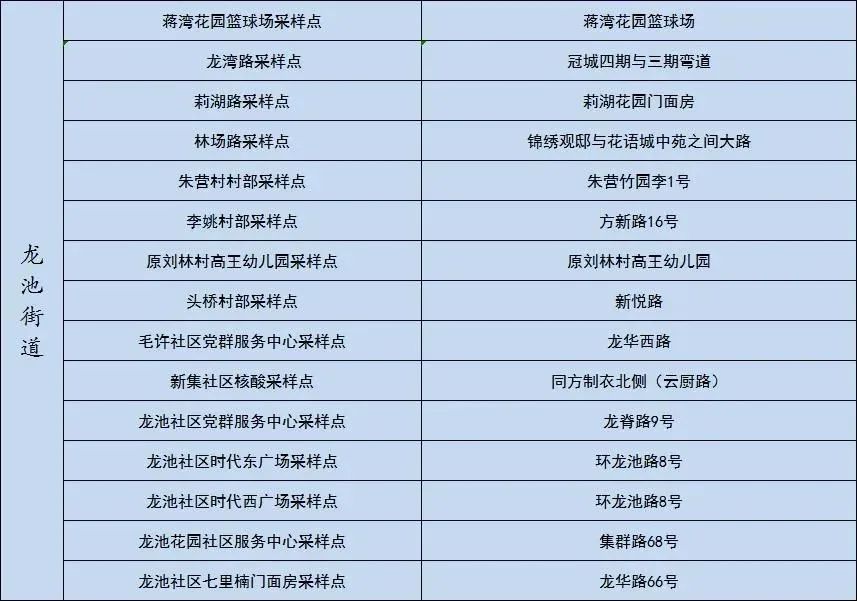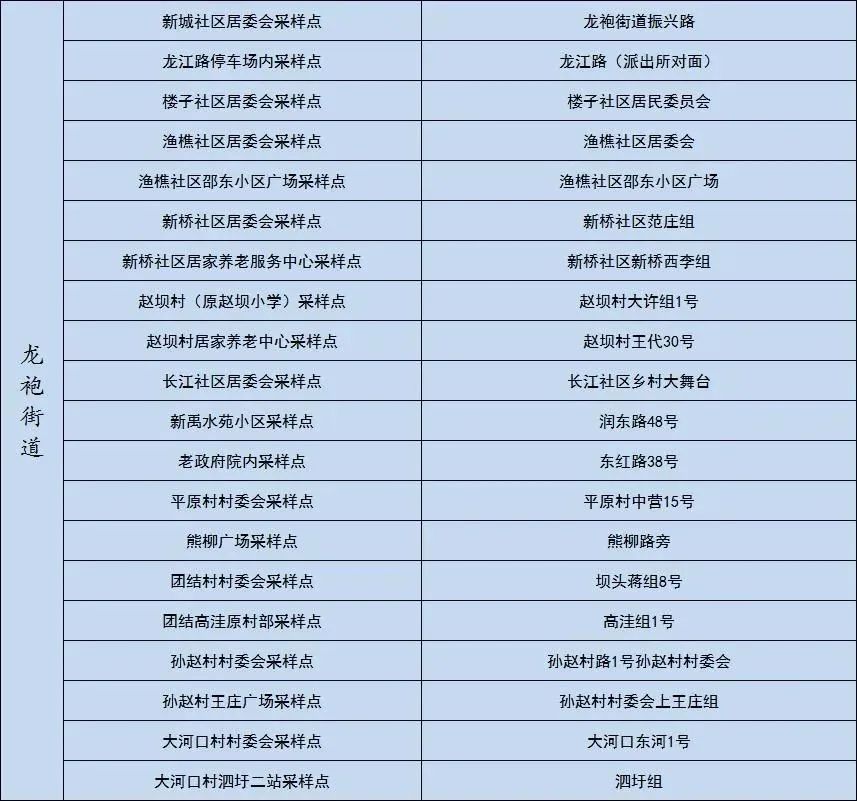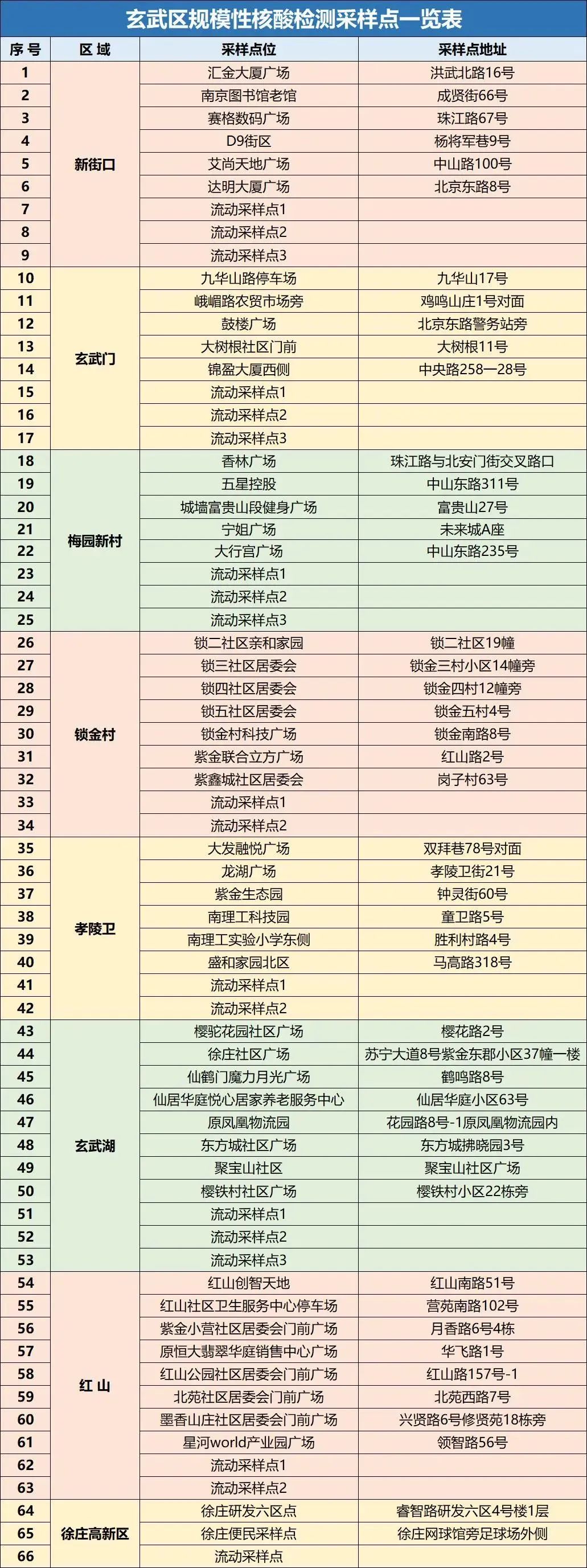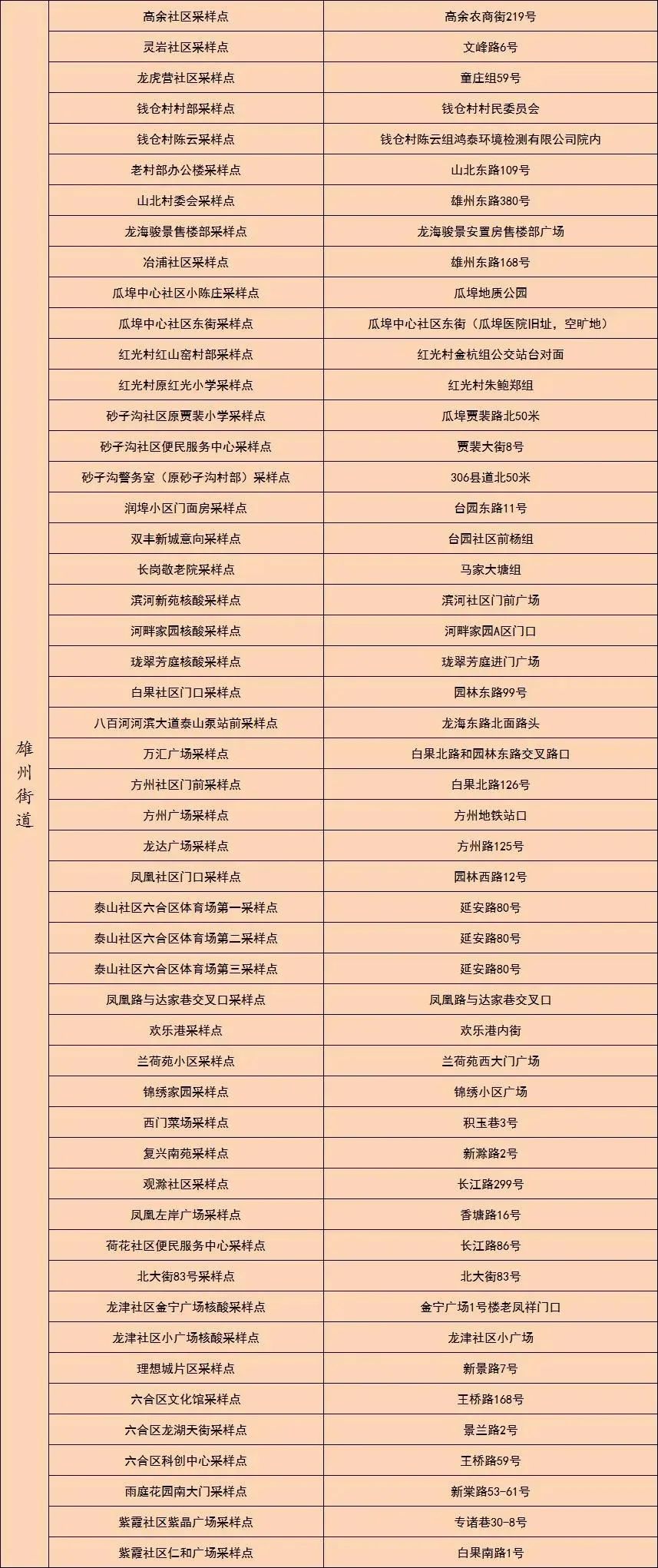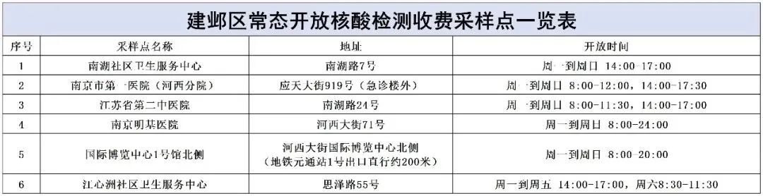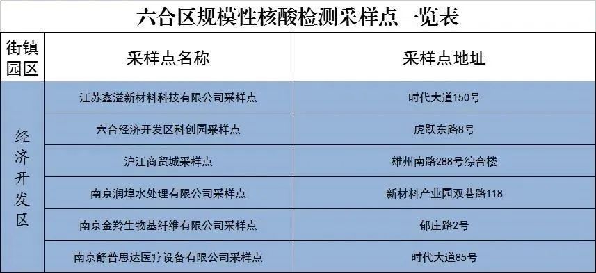 3. 规模性核酸检测工作开展期间,除区人民医院、中医院保留少量自费采样台,六合区主城重点人员核酸检测采样点(六合新城文尚路9号)正常采样雄州、龙池重点人员外,全区其他常设核酸检测采样点原有业务全部暂停,待规模性核酸检测结束后恢复。