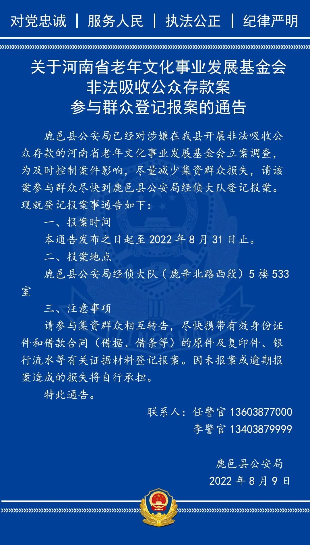 8月9日,鹿邑县公安局发布关于河南省老年文化事业发展基金会非法吸收公众存款案参与群众登记报案的通告。