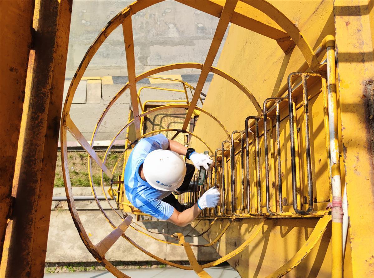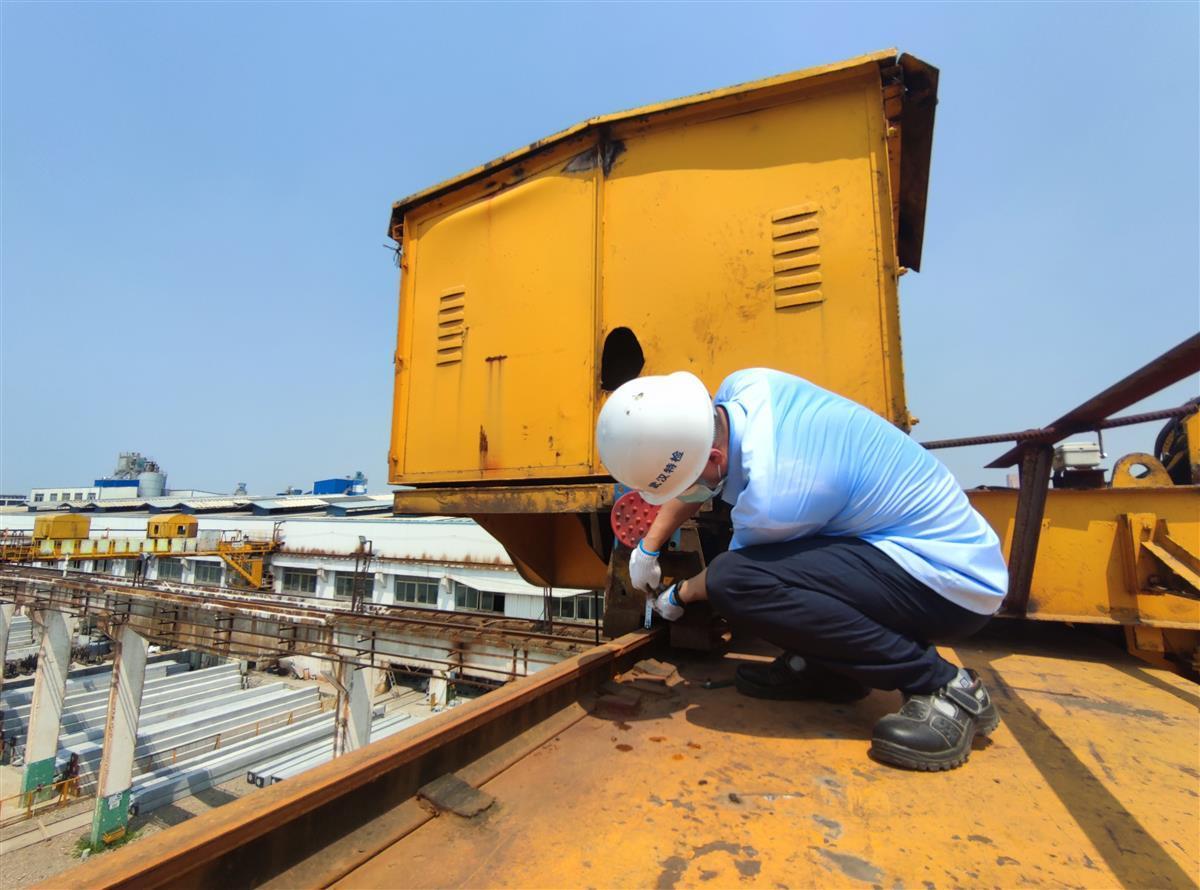 现场,该所检验人员张睿、邹琳、李涛、刘志远戴着安全帽和口罩,顺着梯子爬上距离地面12米高的龙门吊主梁上时,工作服已被汗水湿透。