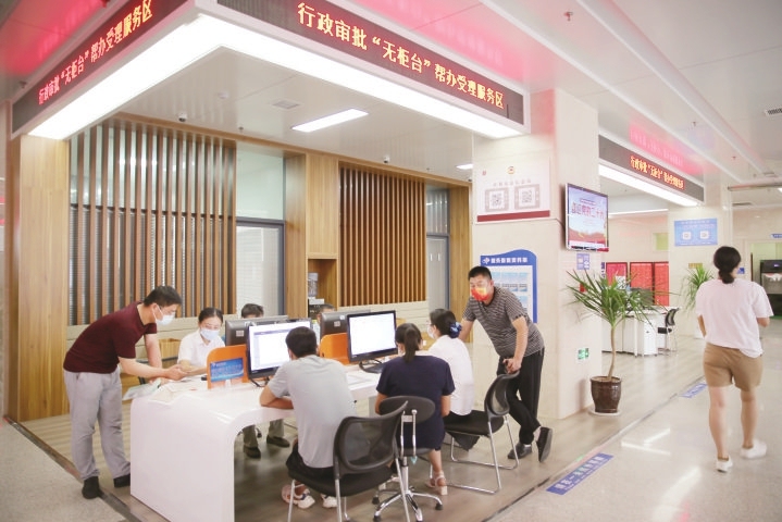 8月4日,群众在日照莒县行政审批服务局与身着白色衬衣、黑色裤子的工作人员“肩并肩”一起办理业务。