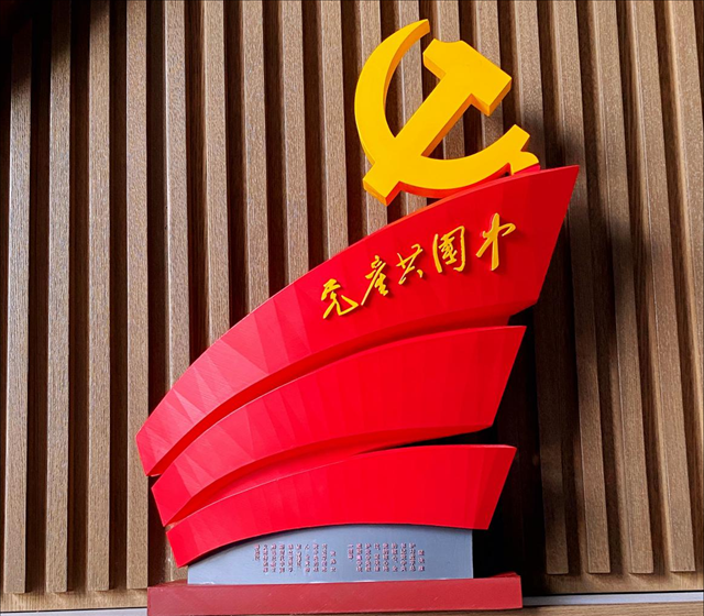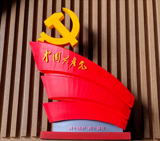 据红色立体雕塑作品项目负责人张大泉介绍,该立体设计作品外观鲜艳夺目,富有张力。釆用海派大师陈佩秋先生推崇的南朝传统绘画六法,气韵生动、骨法用笔、应物象形、随类赋彩、经营位置、传移模写,内在美为主。同时吸收法国共产党员现代世界著名艺术大师毕加索立体主义风格与毛主席题中国共产党五个书法相互融合。整体呈现三面红旗高高飘扬,红船精神融入现代艺术审美,引入严谨细致的工笔艺术和雕塑手法。他说:“两个确立,两个维护”红色雕塑作品历经十二稿,一年零八个月才完成。