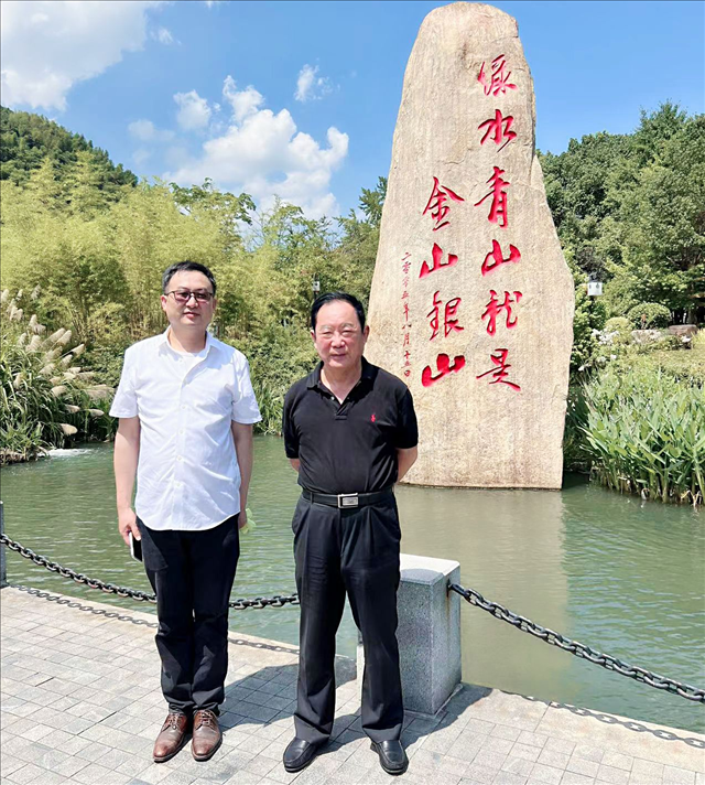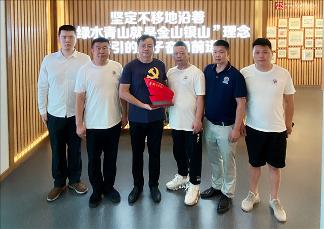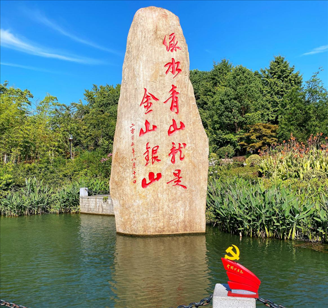 2022年8月4日,浙江湖州天气晴朗,美丽的余村山青水秀,这里是“绿水青山就是金山银山”理论的诞生地。原中央统战部常务副部长朱维群来到安吉余村考察,他将“两个确立,两个维护”红色立体雕塑作品赠予了安吉余村文化馆。