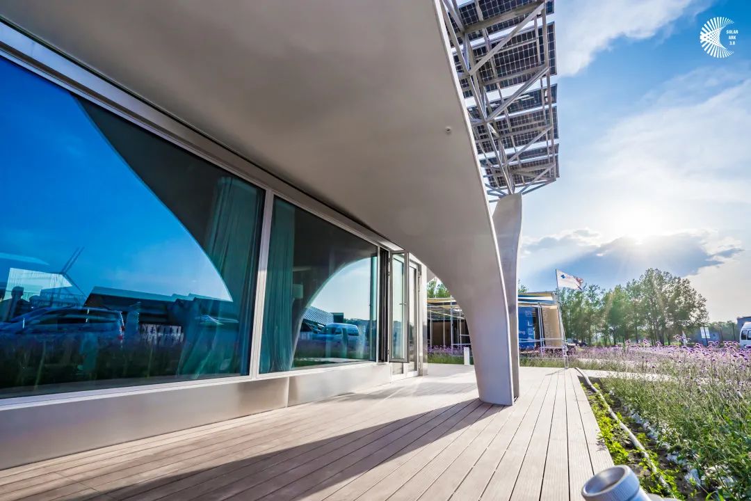 东南大学建筑学院教授张宏介绍,阳光方舟3.0创造了多个第一:世界上第一个采用超高性能混凝土预制装配的双曲面壳体建筑,5天即装配完成,并节省了67%的混凝土使用量;采用了全国第一个用80块东西向布置的光伏板系统,比传统南北西布置每天可多接收阳光3小时以上,房子旁边还加装了风电装置,风光联动。