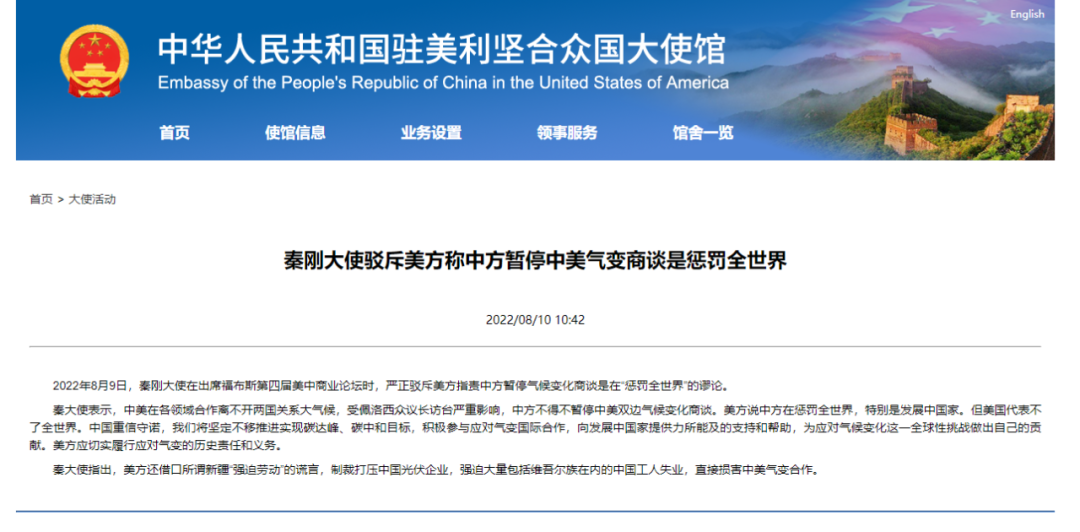 2022年8月9日,秦刚大使在出席福布斯第四届美中商业论坛时,严正驳斥美方指责中方暂停气候变化商谈是在“惩罚全世界”的谬论。