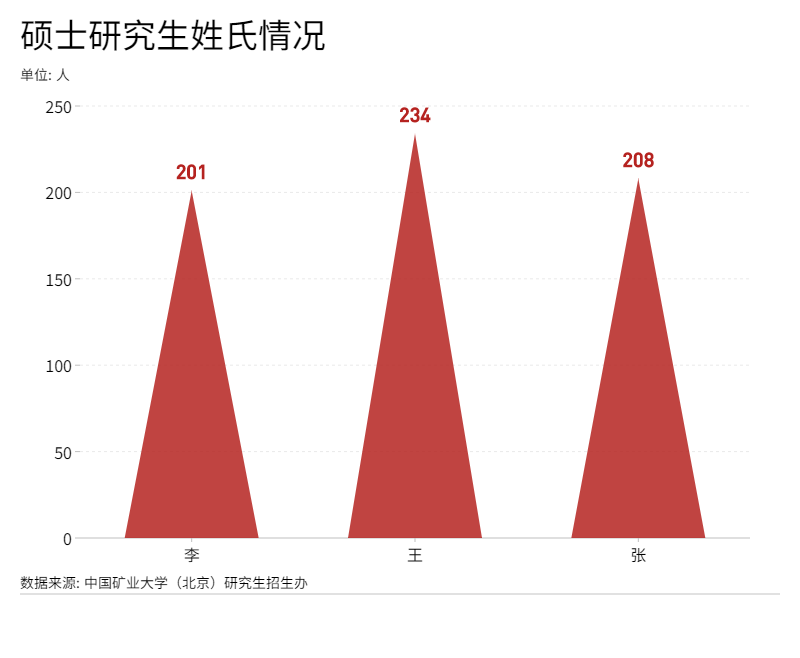 硕士研究生姓氏情况如图。硕士研究生的姓氏中,王、张、李为前三甲,紧随其后的是刘(154)、陈(86)、杨(77)、赵(73)。