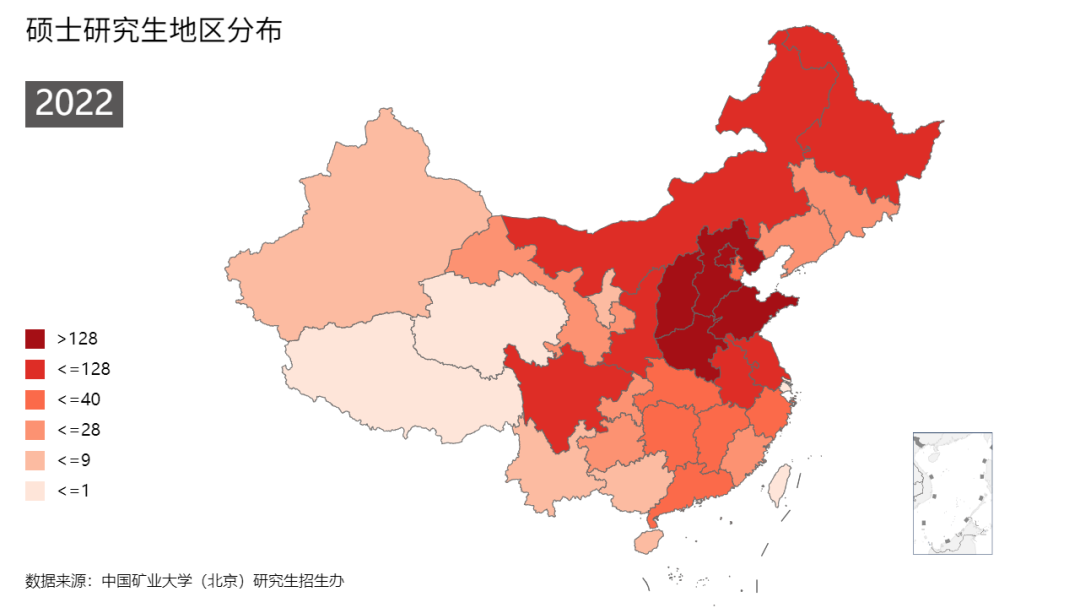 硕士研究生地区分布如图。来自北京、河北、山东、河南、山西的硕士研究生最多。