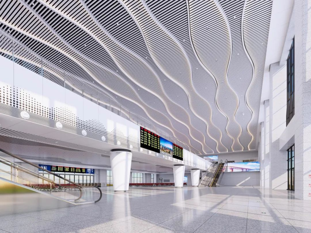 同时,在室内设计中为体现武汉精神,设计者们从武汉的江河切入,以水为元素,通过对水的艺术提炼和抽象变形,结合光影效果及结构特征表达出水的那种涟漪阵阵、波澜不兴。正如武汉通过对河岸治理做到治水、控水,人民才能安心放心的亲水、嬉水。