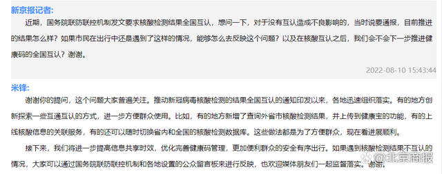 8月10日,国务院联防联控机制召开新闻发布会,介绍近期疫情防控工作有关情况。国家卫健委新闻发言人米锋表示,推动新冠病毒核酸检测结果全国互认的通知印发以来,各地迅速组织落实,一些地方还创新探索了互通互认方式,进一步方便群众使用。比如,有的地方新增“查询外省市核酸检测结果并上传健康宝”功能,有的上线核酸信息关联服务,有的可随时切换省内和全国核酸检测数据库。接下来,我们将进一步提高信息共享时效,优化完善健康码管理,更加便利群众安全有序出行。如果群众遇到核酸检测结果不互认的情况,可以通过国务院联防联控机制和各地的公众留言板向我们反映,也欢迎媒体朋友们一起监督落实。