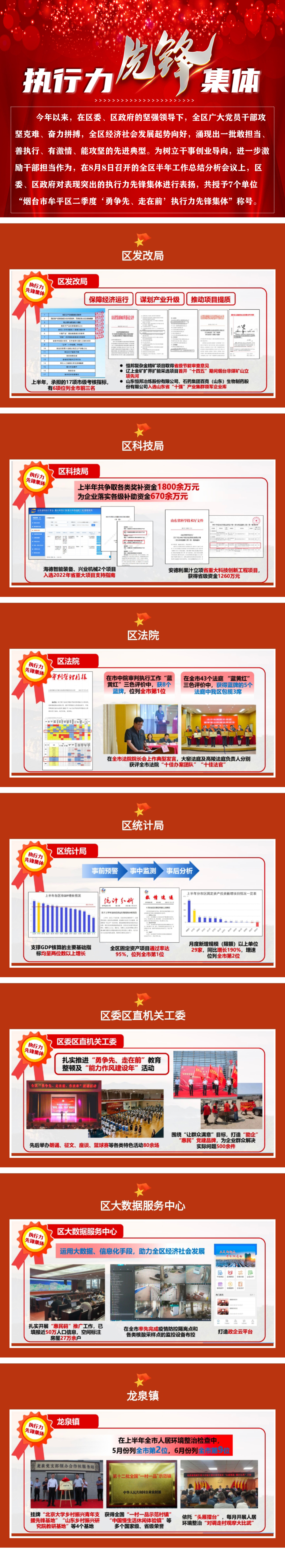 今年以来,在区委、区政府的坚强领导下,全区广大党员干部攻坚克难、奋力拼搏,全区经济社会发展起势向好,涌现出一批敢担当、善执行、有激情、能攻坚的先进典型。为树立干事创业导向,进一步激励干部担当作为,在8月8日召开的全区半年工作总结分析会议上,区委、区政府对表现突出的执行力先锋集体进行表扬,共授予7个单位“烟台市牟平区二季度‘勇争先、走在前’执行力先锋集体”称号。
