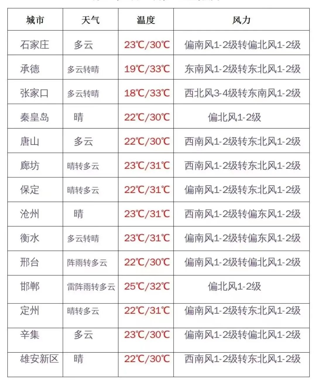 今天白天,石家庄南部、衡水、邢台、邯郸阴有阵雨或雷阵雨,其他地区多云转晴。