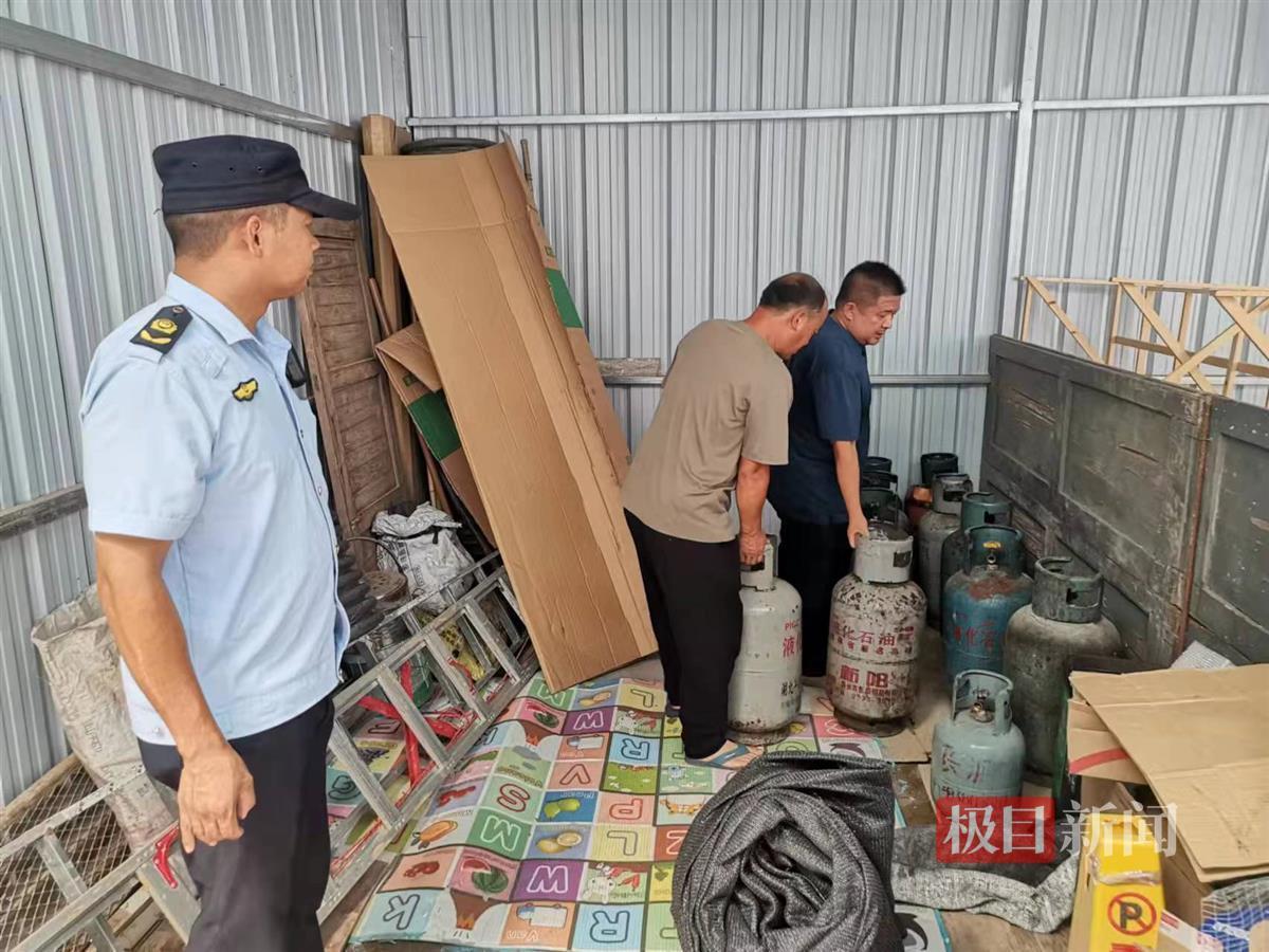 据介绍,8月9日中午,有群众举报称,新洲区旧街街新集村一平房内存有大量液化气钢瓶,新洲区城管部门联合旧街街道综合执法中心执法人员迅速赶到现场。