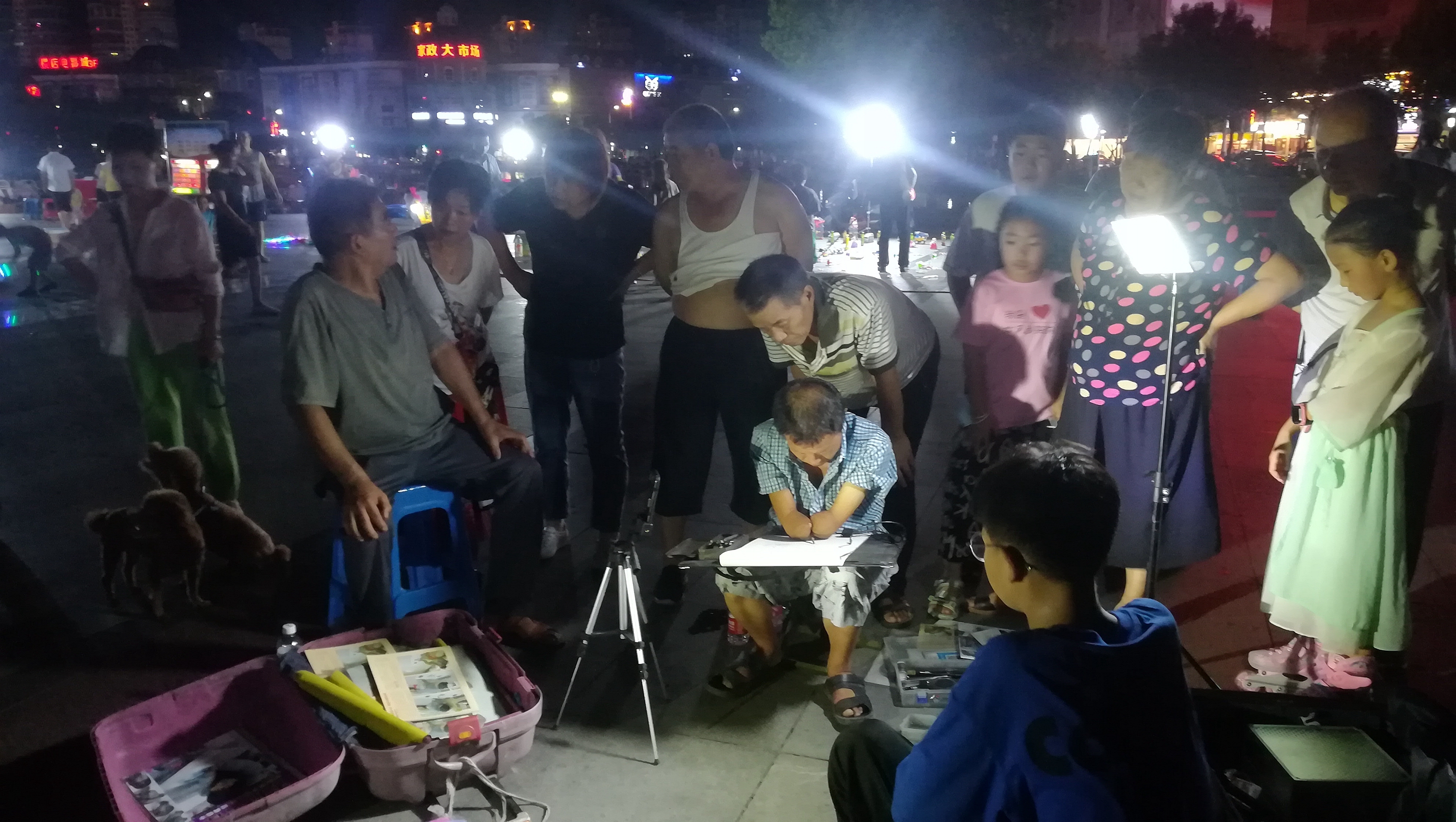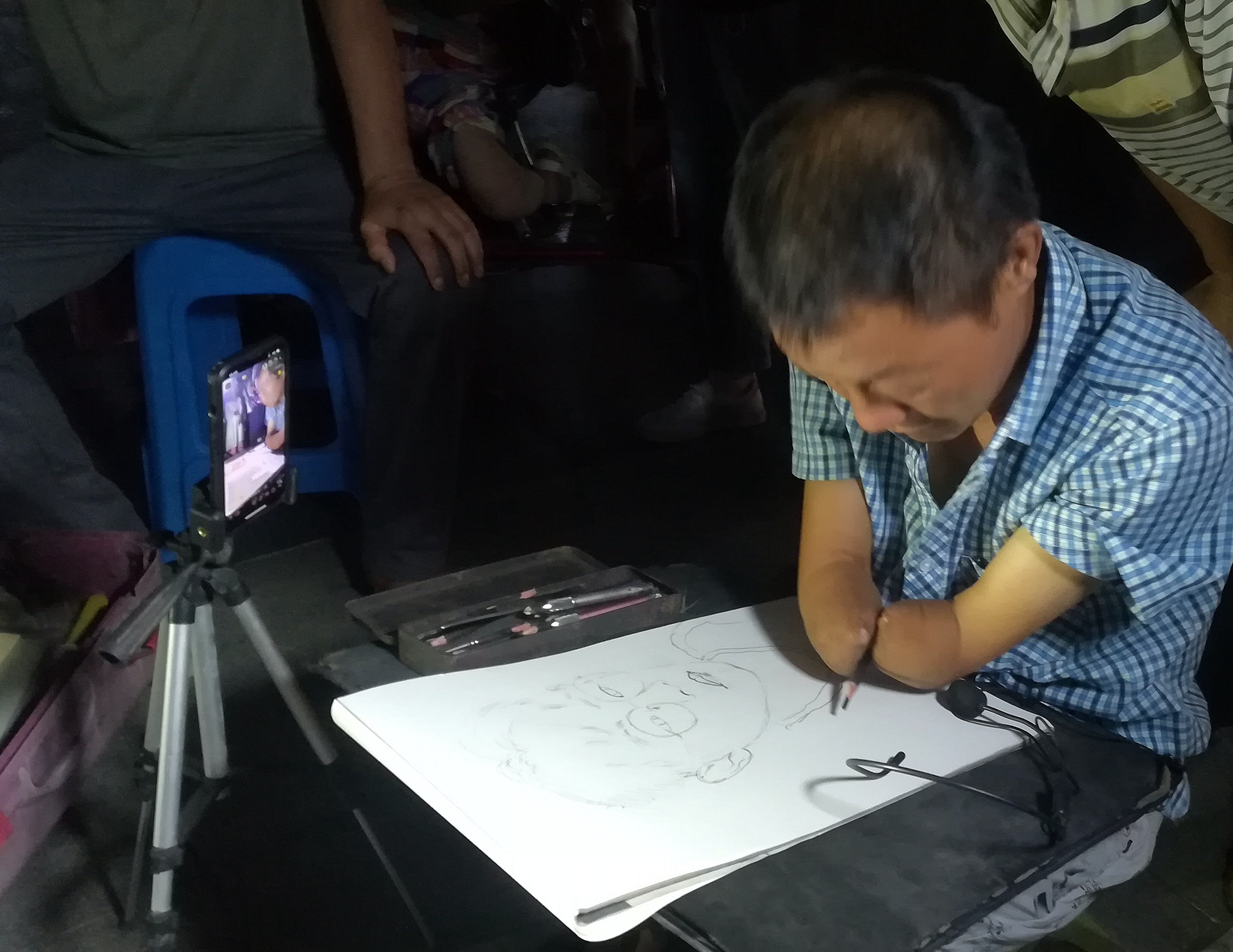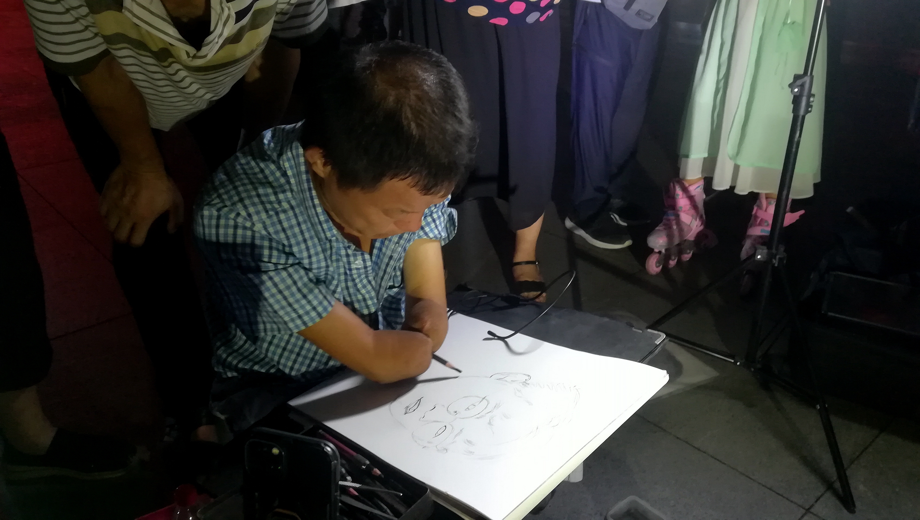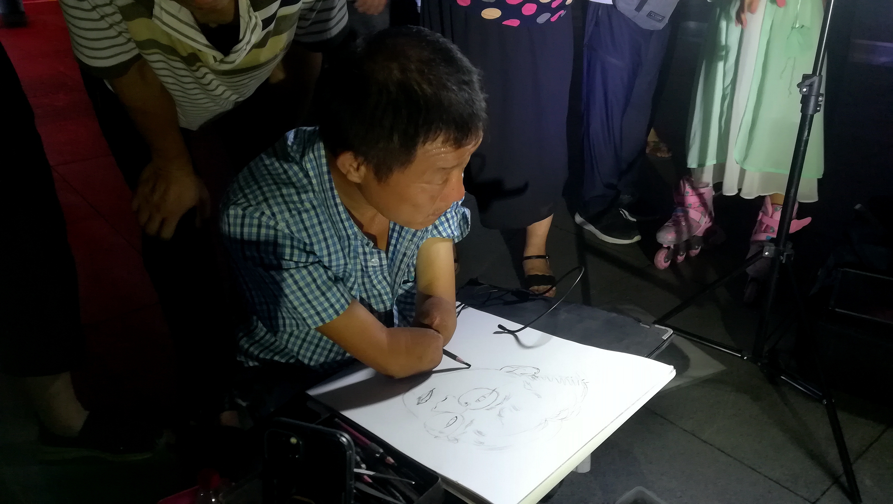 2022年8月9日晚上,在蚌埠淮河文化广场遇见无手素描画家周玉祥,他正在给一位市民免费画素描头像。