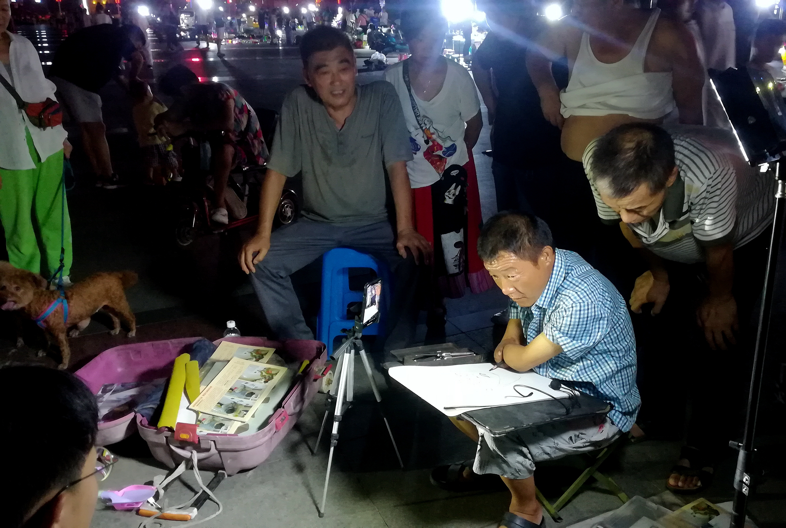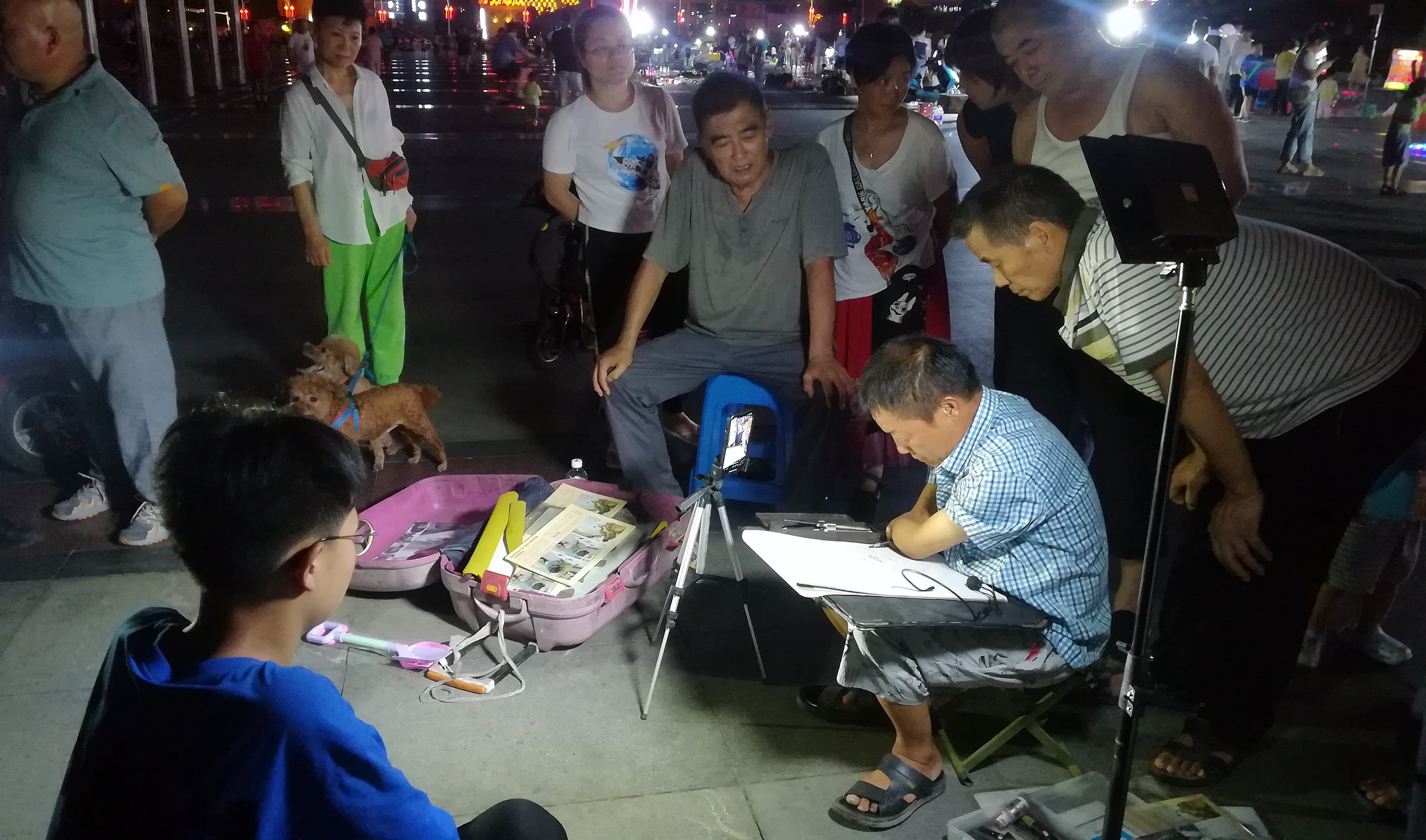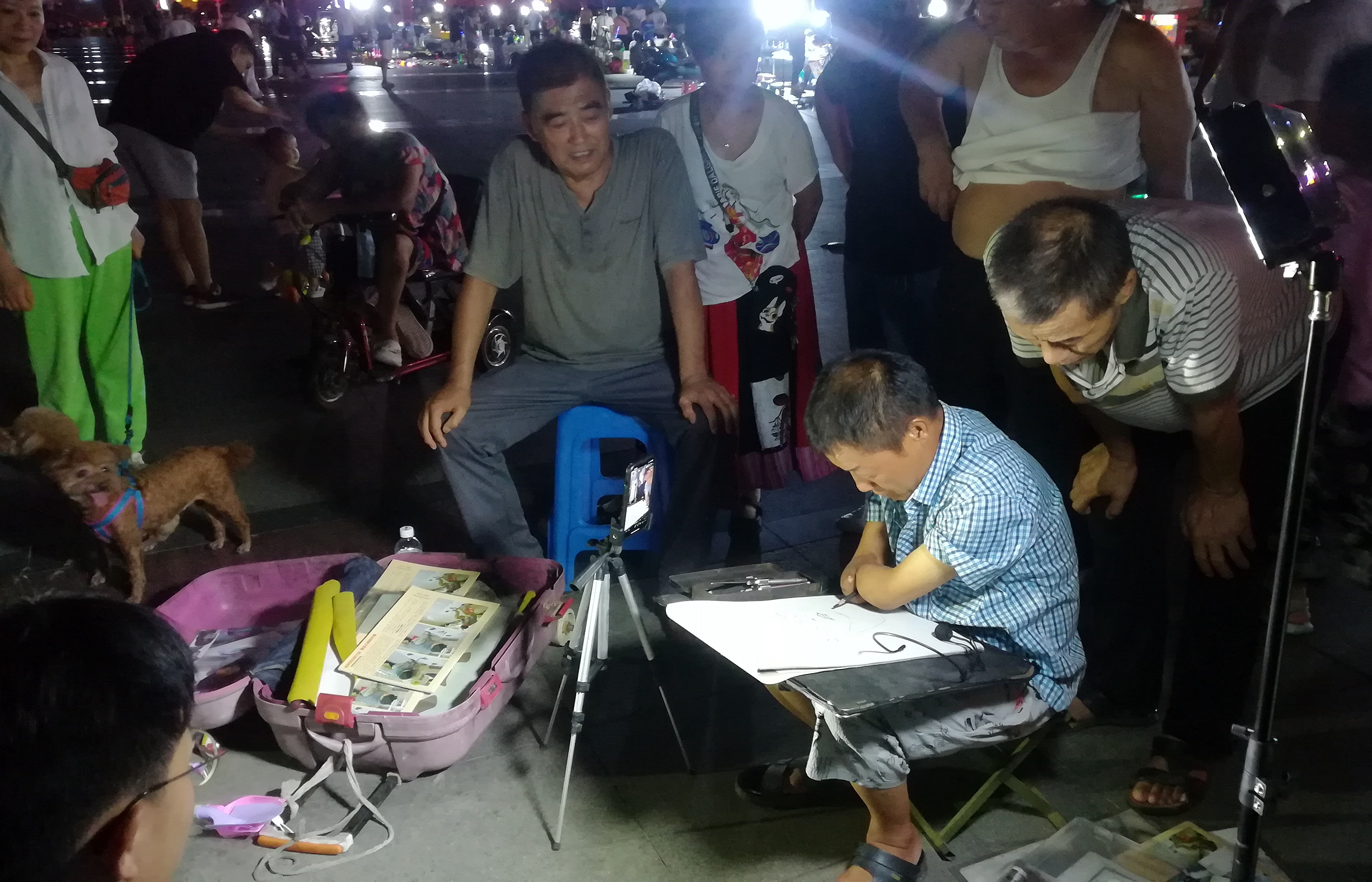 2022年8月9日晚上,在蚌埠淮河文化广场遇见无手素描画家周玉祥,他正在给一位市民免费画素描头像。