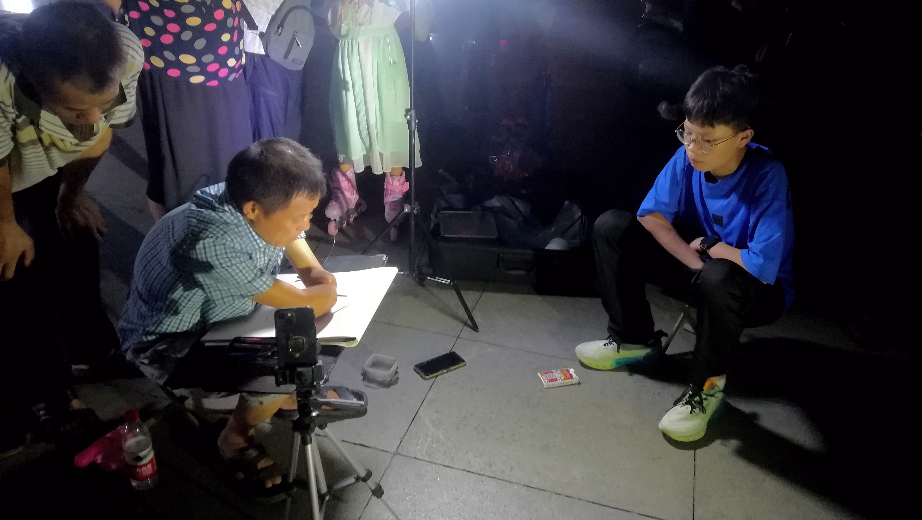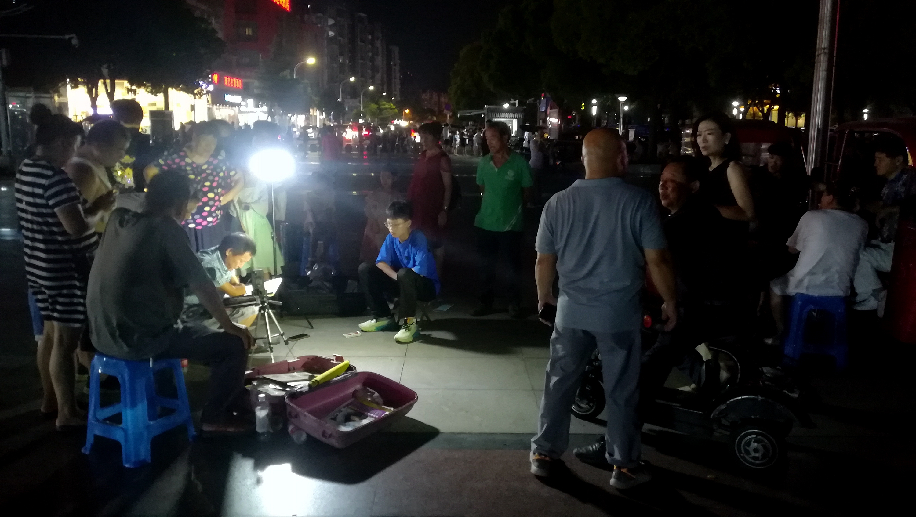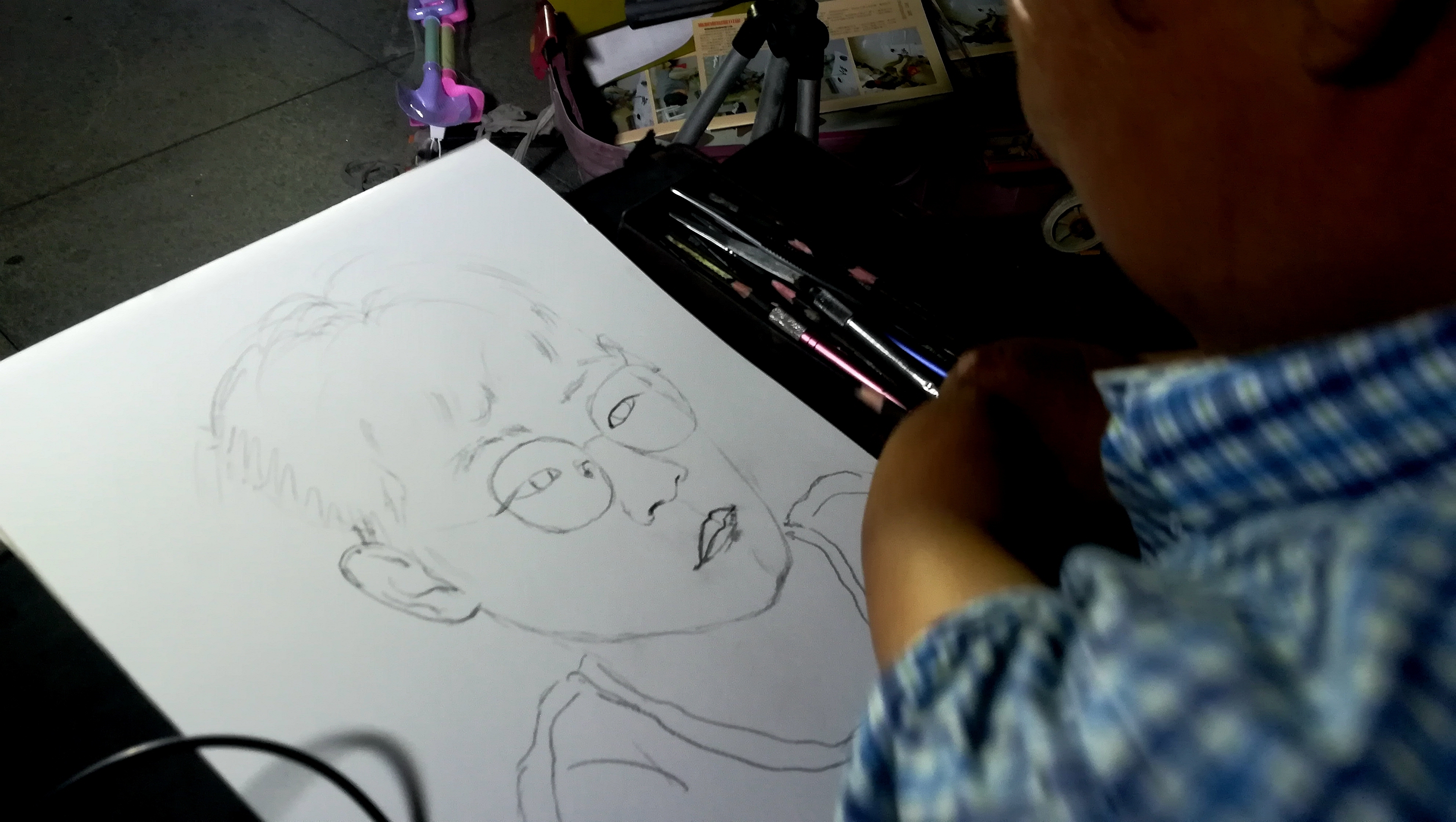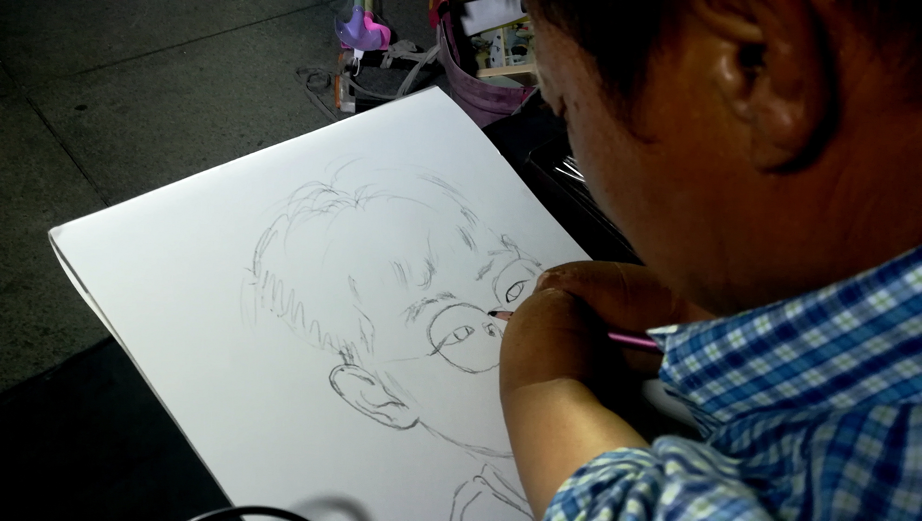 2022年8月9日晚上,在蚌埠淮河文化广场遇见无手素描画家周玉祥,他正在给一位市民免费画素描头像。