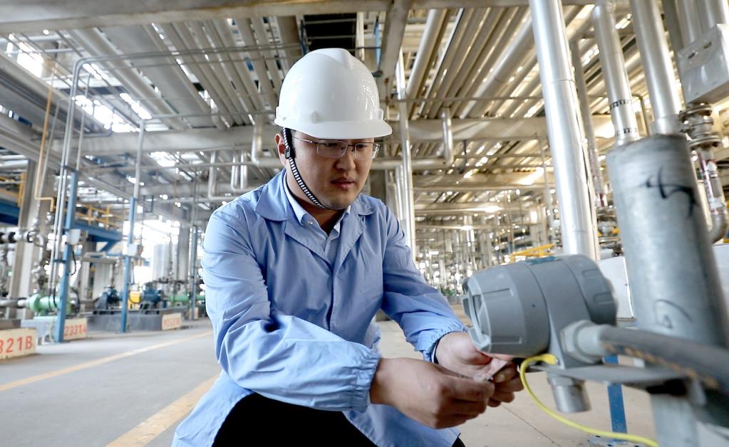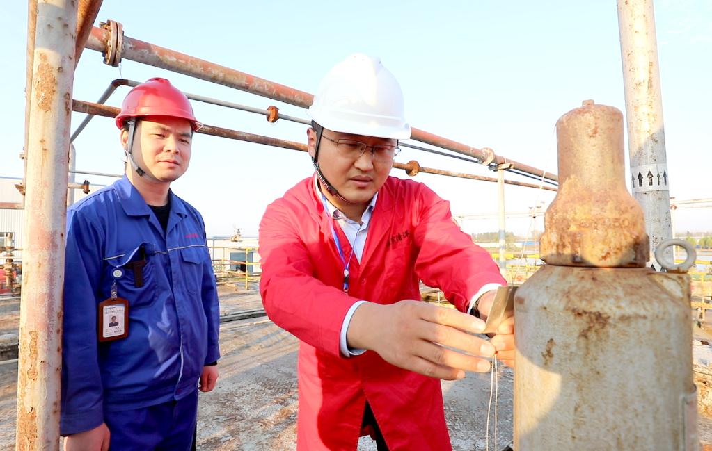 图为陈亚鹏(右)与化工企业员工一起检查生产设备。