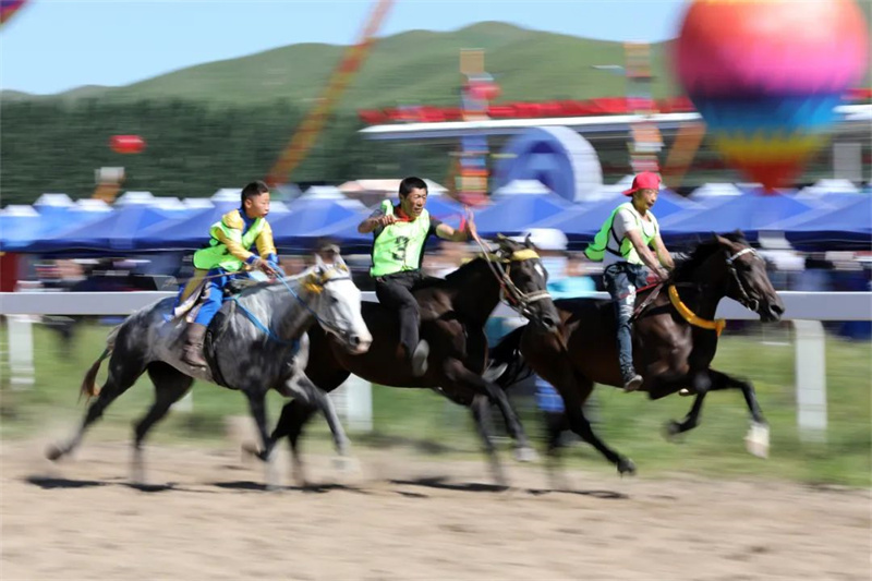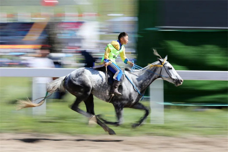 速度马、走马和颠马比赛依次上演,尽展马背民族的豪迈和一往无前的蒙古马精神。看着场上一匹匹骏马飞驰而过,人群中不时传来欢呼与加油声。