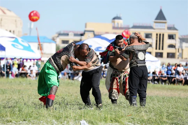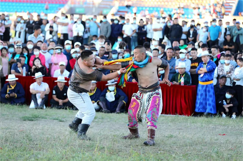 搏克、赛马、射箭被誉为草原“男儿三艺”。在那达慕搏克比赛场地,搏克手身穿跤服,脚蹬蒙古靴,挥舞着壮实的双臂纷纷入场。 搏克手们两两对决,他们时而扎稳马步,时而灵活移动,充分展现了具有浓郁民族特色的蒙古式摔跤风貌。