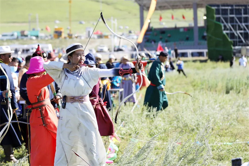 射箭比赛现场,来自全区各盟市的参赛选手身着民族服饰,各个精神抖擞,凝神站立,瞄准目标后,钩弦放箭,动作干净利落。