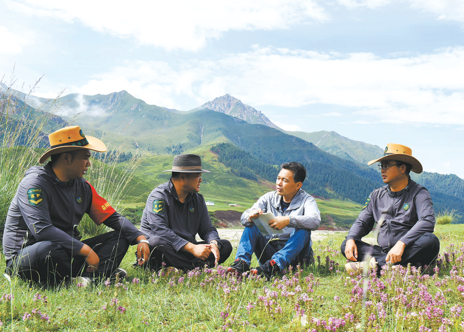 龙仁青(右二)与祁连山国家公园生态管护员交谈。