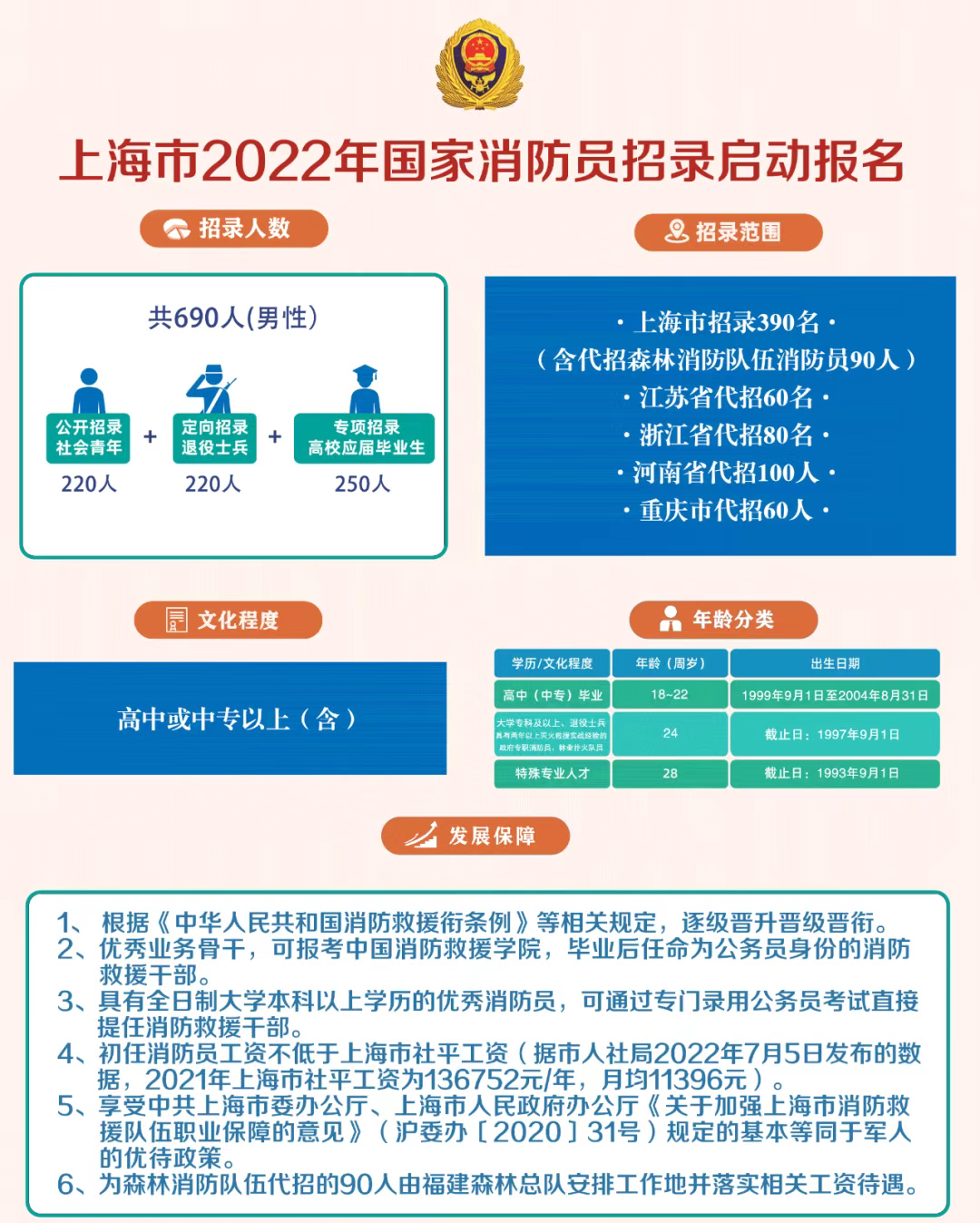 根据《国家综合性消防救援队伍消防员招录办法》(人社部发〔2021〕58号)等政策法规,现就上海市消防救援队伍2022年面向社会公开招录消防员相关事项公告如下: