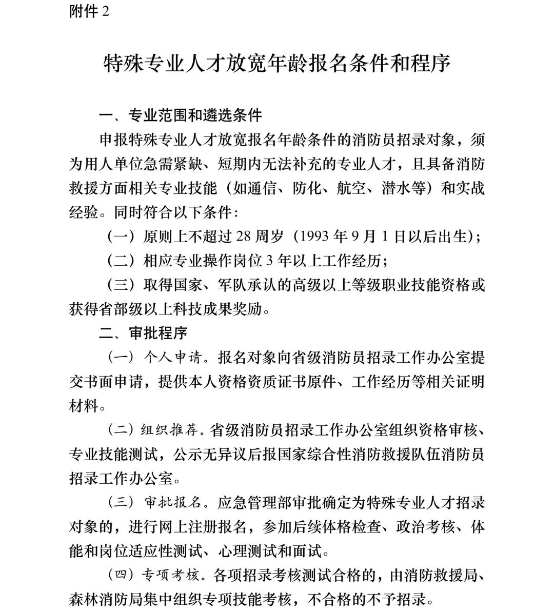 (四)年龄为18周岁以上、22周岁以下,出生时间为1999年9月1日至2004年8月31日。大学专科以上学历人员、解放军和武警部队退役士兵、具有2年以上灭火救援实战经验的政府专职消防队员和政府专职林业扑火队员,年龄可以放宽至24周岁(1997年9月1日以后出生)。对消防救援工作急需的特殊专业人才,经应急管理部批准年龄可以进一步放宽,原则上不超过28周岁(1993年9月1日以后出生);