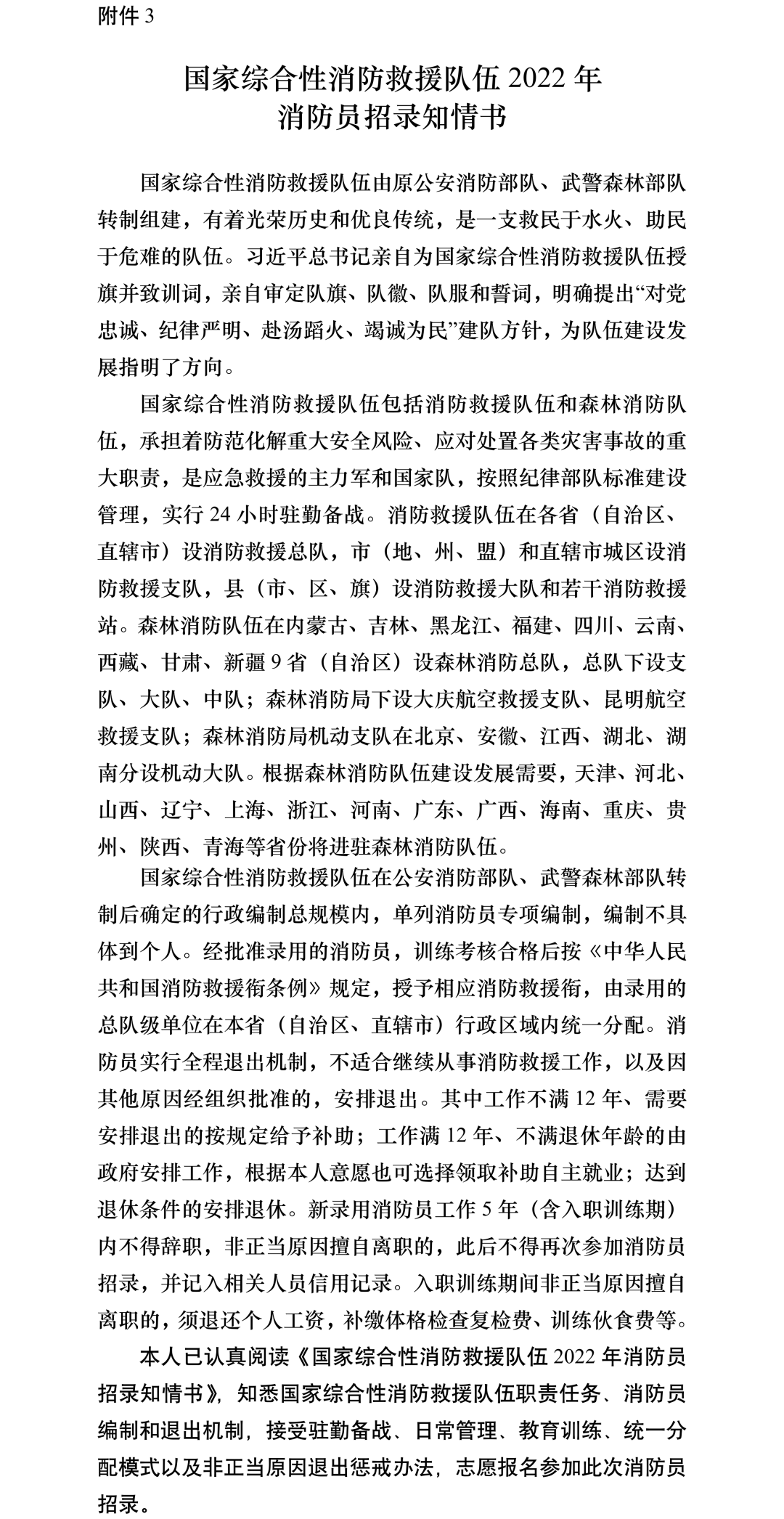 (三)现场复核。招录对象根据网上初审结果,按相关省级招录工作办公室通知要求,由本人携带身份证(居住证)、户口簿、毕业证(学位证)、退役证、个人征信报告、立功受奖等证件证书原件和复印件参加现场复核。年龄放宽至24周岁的政府专职消防队员和政府专职林业扑火队员,须提供本人2年以上消防救援实战工作经历证明和劳动合同、缴纳社保材料。通过复核的,须认真阅读《国家综合性消防救援队伍2022年消防员招录知情书》(附件3),并在《国家综合性消防救援队伍消防员招录报名登记表》上签字确认。拒不签字的,取消报名资格。