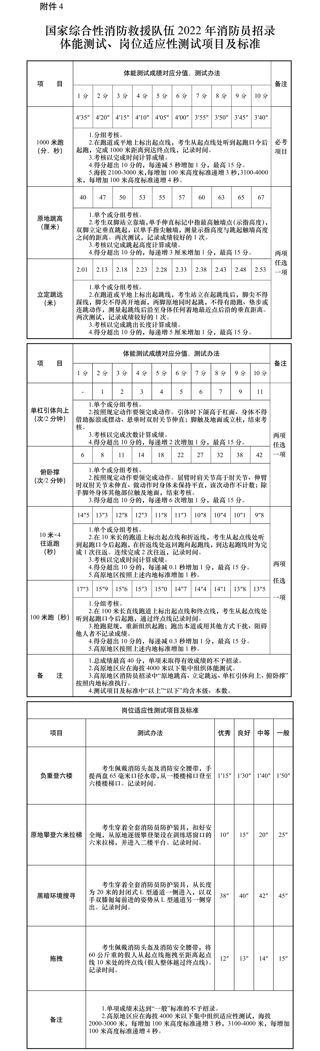 (三)体能测试和岗位适应性测试。按照《国家综合性消防救援队伍2022年消防员招录体能测试、岗位适应性测试项目及标准》(见附件4)执行。单项有效成绩为1分~15分(未取得有效成绩的不予招录),总成绩最高40分。岗位适应性测试单项成绩须在“一般”标准以上。