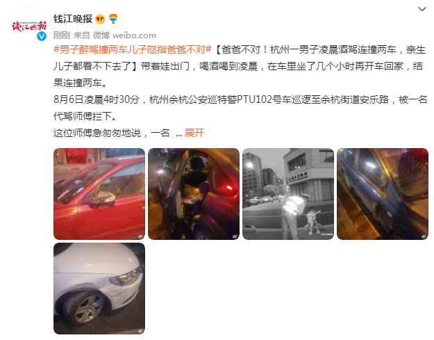 【爸爸不对!杭州一男子凌晨酒驾连撞两车,亲生儿子都看不下去了】带着娃出门,喝酒喝到凌晨,在车里坐了几个小时再开车回家,结果连撞两车。
