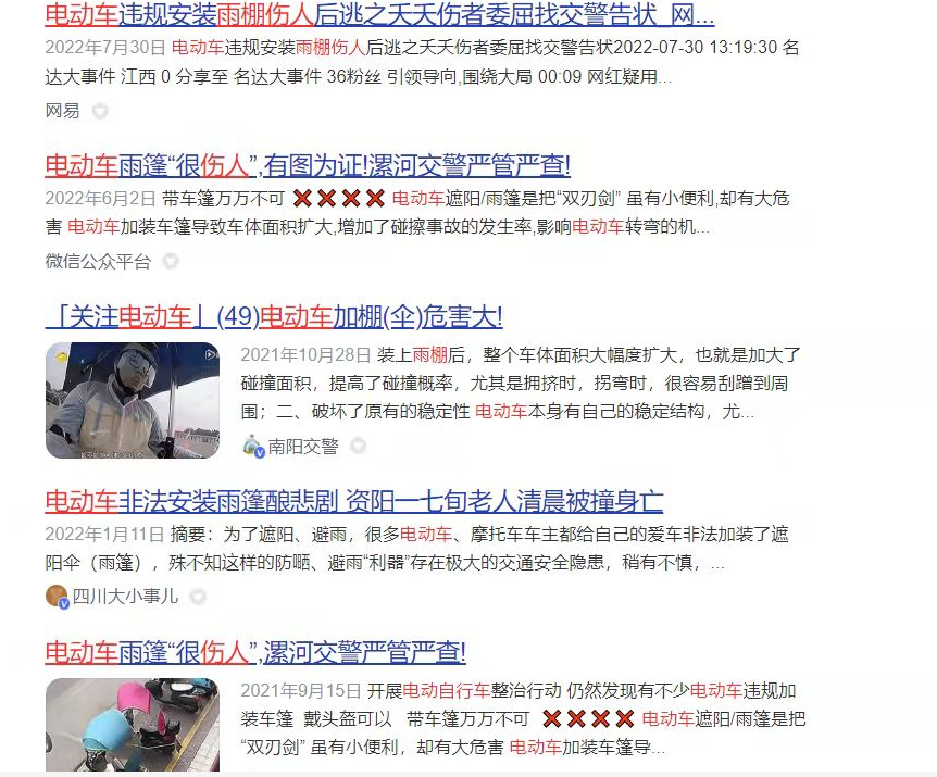 记者随后查阅资料发现,全国各地每年都有电动车雨蓬伤人的案例,其中不少还酿成了严重后果,甚至有人因此身亡。 当这些电动车出现方向偏移、翻倒时,安装在上面的雨蓬此时就成了“武器”,无论是对骑车人自己还是身边的人,都会带来威胁。
