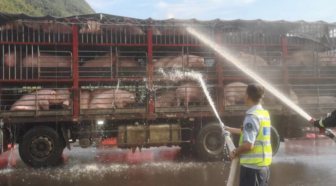 接警后,指挥中心立即组织施救人员赶赴现场,把故障车拖离高速,解救“二师兄”,另一方面联系消防寻求救援。由于路程较远,消防到达现场时间较长,浙江交通集团杭州南管理中心立即派出“微消防”赶赴现场,给现场“二师兄”喷淋降温。施救到达现场后,车内的猪大部分已经瘫到在车厢里,有的四肢抽搐,出现中暑症状。