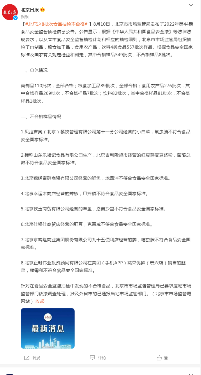8月10日,北京市市场监管局发布了2022年第44期食品安全监督抽检信息公告。公告显示,根据《中华人民共和国食品安全法》等法律法规要求,以及本市食品安全监督抽检计划和相应的抽检细则,北京市市场监管局组织抽检了肉制品,粮食加工品,食用农产品,饮料4类食品557批次样品。根据食品安全国家标准及国家有关规定检验和判定,其中合格样品549批次,不合格样品8批次。