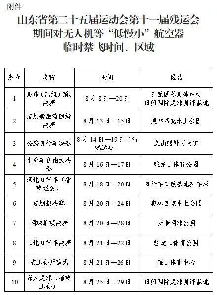 二、2022年8月11日0时至9月21日0时开幕式及赛事期间(时间、区域见附表),场馆(地)及周围半径2公里的区域划定为临时空中管制区。在临时空中管制区域,禁止升降无人机等“低慢小”航空器和放风筝、气球等影响赛事活动安全的行为。确有飞行需要的,除依法报请有关部门审批外,还需经省运会日照市筹备工作委员会书面批准。