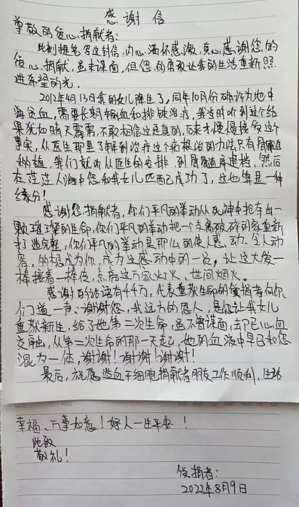 “感谢您的爱心捐献,您的勇敢让我们的生活重新照进阳光。”当天,一封来自患者家属的感谢信辗转交到解冬手中。